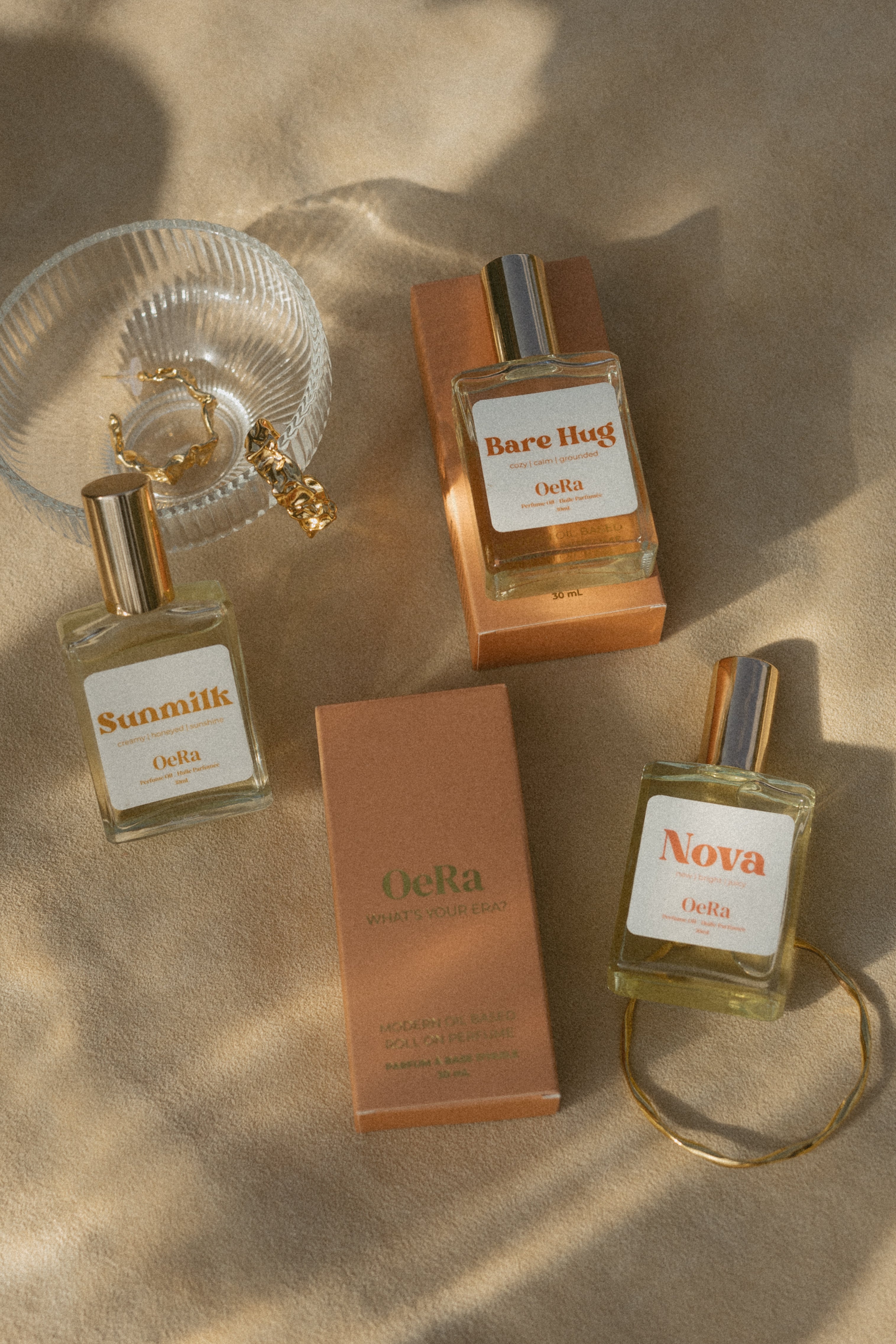 Your scent tells your story. OeRa roll-on perfumes are oil-based, clean, and conscious—crafted to capture who you are in every era.